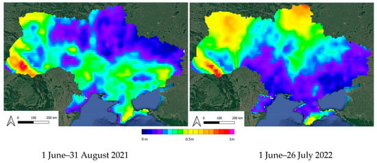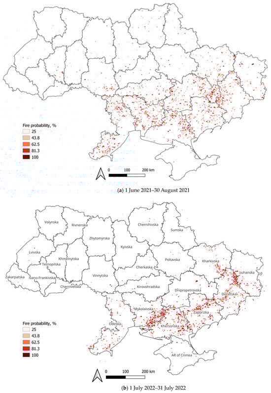 Contextual algorithms used by FIRMS [53] compare the temperature of an area suspected of having a fire with the temperature of the surrounding land cover. When the temperature difference exceeds a predetermined threshold, the suspected area is confirmed as an active fire or a “hot spot”. Figure 2 shows the distribution of fires determined according to FIRMS data for summer 2021 (1 June 2021–30 August 2021) and for July 2022 (1 July 2022–31 July 2022).