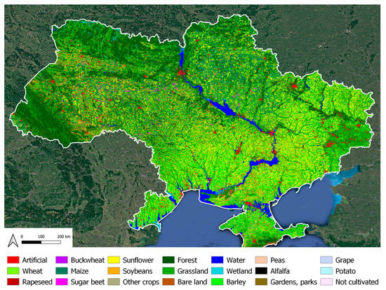 To identify the type of land cover affected by fires, a land cover and crop type map (Figure 3) is used, which was created by using cloud technologies and neural network models [60,61,62]. For classification processing, 2 bands (VV, VH) of SAR Sentinel-1 descending data with 10 m spatial resolution are used with preliminary preprocessing steps using SNAP 9.0.0 software: Correction of coordinates in the orbit, Specl-filtration, Radiometric calibration, the Range-Doppler Terrain Correction, Data transfer in decibel, and Creating a Data Stack. Also, for classification processing 4 bands (Red B4, Green B3, Blue B2, InfraRed B8) of Sentinel-2 satellites with preprocessing Level-2A and 10 m spatial resolution are used. The revisit time of Sentinel-2 is 5 days, but due to high cloud cover, monthly composites were obtained as the median value of all possible values for every 5 days in the respective bands. A Scene Classification Map (SCL) band with a spatial resolution of 20 m was used to mask clouds from optical data. Optical composites were obtained in the Google Earth Engine cloud platform along the extent of each path of Sentinel-1 data.