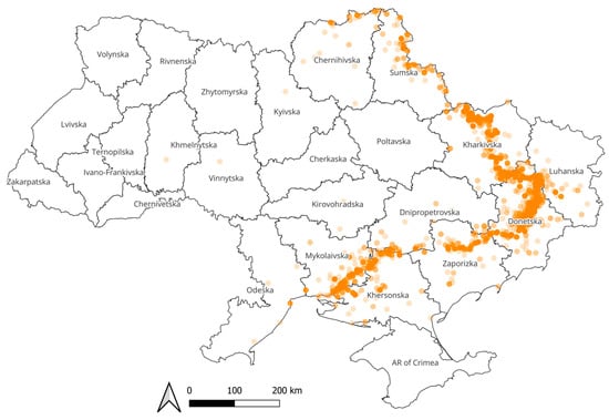 The Armed Conflict Locations and Events Data (ACLED) military operations [69] database was chosen as an additional source of information on human activity that can cause fire. The database provides the geolocation of the settlements in which or not far from which the military actions took place. This database collects a variety of events, including Armed clash, Looting/property destruction, Remote explosive/landmine, but we only selected Shelling/artillery/missile attack, which primarily affects the occurrence of fires. The Figure 4 shows Shelling/artillery/missile attacks for July 2022. As we can see, the concentration of the given points is the greatest precisely in the military zone, and also corresponds to fires during these same periods (Figure 2).