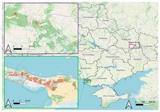 In order to perform additional validation of the burned areas map, within this work, the provided vector data with fires created manually on the basis of high-resolution satellite data (Planet/WorldView-3) and Sentinel-2 data was used. This dataset represents fires from shelling in the south (Khersonska oblast) and east (Kharkivska and Donetska oblasts) of Ukraine in 2022 (Figure 5). In particular, for the south of Ukraine, we used fire boundaries for 19 May 2022 (1029 polygons), and for the east we employed the data for the period from 5 July 2022 to 30 July 2022 (984 polygons). These data were collected by our partners within the “Satellites for Wilderness Inspection and Forest Threat Tracking” (SWIFTT) project.