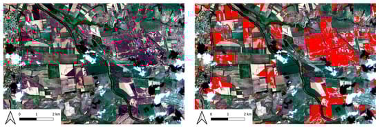 Ground truth data collected along roads were used as training data for the neural network. The overall accuracy of the classification map was calculated based on the confusion matrix [63]. In turn, the confusion matrix was created by comparing the obtained classification map with the collected independent test ground truth data. The overall accuracy of land cover classification maps was 95%.