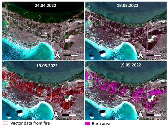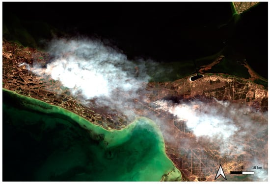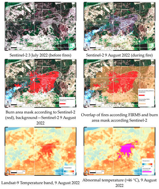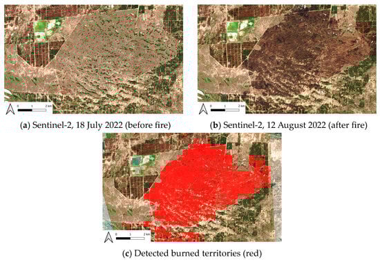 The Landsat 8 satellite payload consists of two science instruments—the Operational Land Imager (OLI) and the Thermal Infrared Sensor (TIRS). These two sensors provide seasonal coverage of the global landmass at a spatial resolution of 30 m (visible, NIR, SWIR); 100 m (thermal); and 15 m (panchromatic). While OLI provides data at a 30 m spatial resolution, the TIRS band 10 (10.6–11.19 mm) was resampled at 30 m and was used to validate the created burn area mask [57]. Since the combined revisit time of the Landsat-8 and -9 together is 8 days, which is almost two times less often than Sentinel-2, the validation was carried out selectively for cloud-free images and for the test part of the territory.