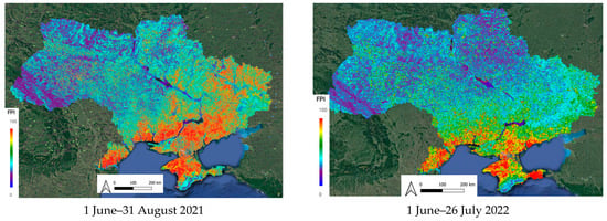 In this work, the FPI index is used to assess the fire danger risk level, which was calculated for the first time for the full territory of Ukraine according to the methodology used in the American NFDRS information system [64]. Thus, initially, the inputs to the FPI model are a 1 km resolution fuel model map, a Relative Greenness (RG) map [65] that indicates current vegetation greenness compared to historical maximum and minimum values, and a 10 h time lag dead fuel moisture map [66]. The output is a national-scale, l km resolution map that presents FPI values ranging from 1 to 100 [28]. In work [67], the authors used MODIS data with a spatial resolution of 500 m for the territory of Spain.