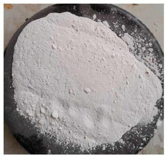 The ladle slag used in this study is from a hot steel foundry and rolling plant located in the southern region of Spain. As depicted in Figure 1, the ladle slag exhibits a distinctive white coloration. These slags come from the secondary phase of refining molten steel. Initially, white slag is stored in designated slag bins within the manufacturing facility. Subsequently, the white slag undergoes a conditioning process, encompassing physical cooling treatment, metal separation, and size reduction. In Section 3.1, a comprehensive analysis of the ladle slag’s chemical and mineralogical characteristics is provided. For the binding agent, gypsum, in accordance with EN 13279-1:2009 [], was utilized.