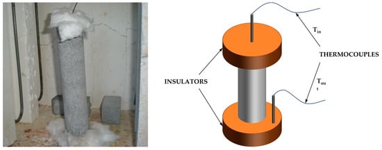 The time necessary to reach a temperature of 550 °C (t550) in the center of the sample is referred as the fire insulating capacity. As illustrated in Figure 1, cylindrical samples were subjected to controlled heating as defined in EN 1363-1 [] and consistent with previous research [,]. To ensure uniform heat distribution, ceramic fibers were employed to insulate both the bottom and top surfaces of the cylinder. Consequently, the samples encountered radial heat flow, which is symmetric. The relationship between fire temperature (T) and exposure time (t) can be expressed as T = 20 + 345·log(t + 1). For this test, as it can been seen in Figure 2, larger cylinder molds were required, with dimensions of 4.2 cm in diameter and 20 cm in height, including a 10 cm wire placed centrally. This test was conducted after a curing period of 28 days. This wire served a dual purpose, facilitating the placement of a thermocouple, which measures the interior temperature of the cylinder upon in entering the oven, and acting as a structural support. The critical parameter in this test is the time taken for the center of the cylinder to reach 550 °C (t550), which signifies the onset of failure of the protective metal structure intended to shield the material from the fire.