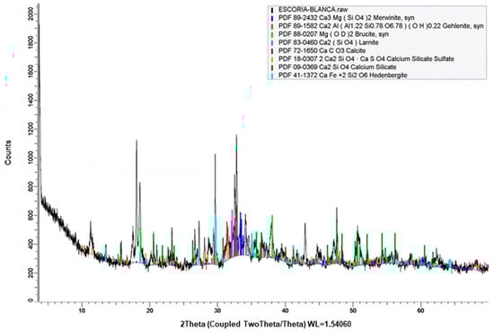 The specific gravity of ladle slag, as determined by EN 1097-7 [], is notably 30% lower than that of gypsum (4.06 g/cm3), as shown in Table 2. The mineralogical characterization, depicted in Figure 3 through X-Ray diffraction, reveals the predominant presence of calcium silicates (larnite, gehlenite, calcium silicate sulfate, calcium silicate), calcium–magnesium (merwinite), and ferric (hedenbergite) phases, accompanied by quartz, calcite, and brucite. An estimate of the percentage of amorphous and crystalline material in the sample, obtained by comparing the area under the curve corresponding to the material with diffraction lines and the area encompassed by the rest of the diffractogram, indicates that the sample comprises 67% crystalline phase and 33% amorphous phase.