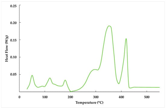 A DSC analysis was conducted to assess the amount of heat energy absorbed by the ladle slag in the heating process. Ladle slag was carefully deposited in aluminum containers and heated at a rate of 2 °C per minute, ranging from 25 to 500 °C. Nitrogen gas was employed as the purging gas throughout the test, following established procedures [].