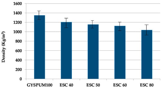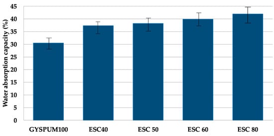 Figure 5 depicts the density variations among the different mixtures. Notably, an increase in ladle slag content results in a decrease in density. This can primarily be attributed to ladle slag’s lower specific density (as indicated in Table 2) compared to gypsum. Additionally, the slightly larger particle size of the slag also produces a decrease in density. According to EN 12859, gypsum-based materials can be classified into three categories based on their density: high (between 1100 and 1500 kg/m3), medium (between 800 and 1100 kg/m3), and low (between 600 and 800 kg/m3). All the compositions in this study fall under the high-density classification. Figure 6 illustrates the water absorption characteristics of the various mixtures. Water absorption capacity exhibits an inverse relationship with density; the lower the density, the greater the porosity, and therefore the greater the volume of voids available for water absorption.