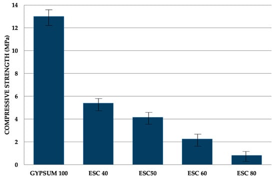 Figure 7 shows the compressive strength values of the mixtures. It is noticeable that increasing the quantity of slag reduces compressive strength. These findings demonstrate a clear inverse relationship with porosity. As per EN 13279-1 [], the standard specifies that the compressive strength of gypsum-based materials should be equal to or exceed 2 MPa, a requirement that all samples, except ESC 80, meet.