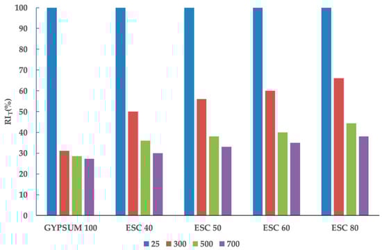 Figure 8 shows the evolution of the RIT of the different compositions at ambient temperature, 300 °C, 500 °C, and 700 °C. The compressive strength of gypsum experiences a significant decrease at 300 °C due to an endothermic reaction, the dehydration of gypsum (CaSO4·2H2O → CaSO4 + 2H2O), which occurs within the temperature range of 120 to 150 °C []. At higher temperatures, the reduction in the RIT is much less pronounced because gypsum does not undergo any reactions leading to mass losses. At 300 °C, the decrease in RIT is less pronounced when the ladle slag percentage is higher, primarily due to the lower mass loss exhibited by the slag. At 500 °C, a noticeable reduction in RIT is observed in mixtures containing predominantly ladle slag, due to the dehydration of metastable calcium aluminate hydrates (Figure 4). At 700 °C, the compressive strength of samples with a substantial amount of gypsum decreases because the gypsum used in the mix contains additional calcium carbonate in its dosage. The decrease in the compressive strength of samples with a relevant amount of ladle slag is only slightly lower than at 500 °C. This reduction is primarily attributed to the decomposition of portlandite at 450 °C and minor weight loss peaks associated with the decomposition of carbonates, occurring between 680 °C and 800 °C.