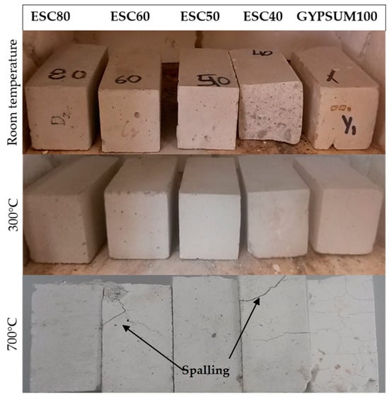 Macroscopic observations of the samples, depicted in Figure 9, reveal that at 300 °C there are no visible cracks on the specimen surfaces. However, at 700 °C, the degree of deterioration has increased compared to gypsum-based samples. It is evident that spalling phenomena have occurred at 700 °C. Significantly, a distinct pattern becomes evident: as the quantity of slag increases and the temperature rises, the compressive strength values of the mixtures decrease.