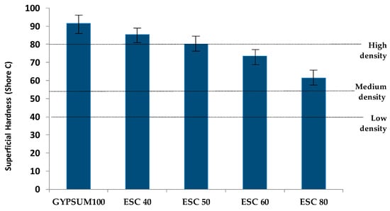 Figure 10 shows the surface hardness values measured from the various samples after 28 days of setting. The higher the proportion of white slag, the lower the hardness value. The EN 12859 standard [] dictates the specifications for superficial hardness that materials must meet according to their density classification, which categorizes them as high (>80 Shore C), medium (>55 Shore C), or low density (>40 Shore C). Of the different compositions, only those with less than 50% ladle slag content exhibit values surpassing the threshold for high-density materials. Surface hardness is a property that exhibits a direct inverse relationship with porosity. A higher porosity produces a lower hardness, as in study [].