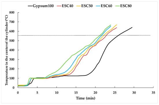 Figure 11 illustrates the fire insulating capability of the various mixtures. As the water-solid is increased when the dosage of the ladle slag is, this produces a high porosity, increasing the humidity retained in the pores; this water is evaporated at temperatures around 50 °C, decreasing the slope of the curves before the evaporation plateau. The chemically bound water content in gypsum-based materials plays a crucial role in enhancing fire-resistant behavior, as it prolongs the time required to reach 100 °C. Interestingly, a higher ladle slag content results in a shorter time needed to reach 100 °C. At 100 °C, there is a sustained period during which the temperature remains constant, attributable to the endothermic dehydration reaction of gypsum (CaSO4·2H2O → CaSO4 + 2H2O). This reaction absorbs the energy transmitted by the fire, thus keeping the temperature constant at the core of the cylinder. While the inclusion of ladle slag introduces calcium aluminate hydrates, which also undergo endothermic decomposition, the energy absorbed by these hydrates is less than that absorbed during gypsum dehydration. Therefore, the duration of the evaporation plateau decreases with increasing ladle slag content. Beyond the evaporation plateau, the introduction of ladle slag results in the emergence of new, smaller evaporation plateaus (e.g., at 170 °C for the dehydration of metastable calcium aluminate hydrates, at 300 °C for the dehydration of stable calcium aluminate hydrates, and at 450 °C for the decomposition of portlandite). For this reason, the differences in t550 between Gypsum100 and samples with slag additions are smaller than the disparities in the duration of the evaporation plateau. For instance, in the case of ESC60, the length of the evaporation plateau is 50% shorter than that of Gypsum100, but the t550 is only reduced by 18%.