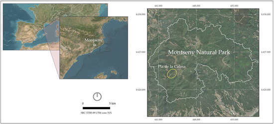 The figure displays the study area’s location within the Montseny Natural Park, a Biosphere Reserve. Pla de la Calma, the area of interest, is indicated by the yellow circle.