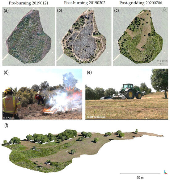 (a–c) This sequence of RGB orthomosaics (0.01 m/px.) illustrates the process of the treatment and subsequent gridding. (d) Specific details of the controlled prescribed burning treatment conducted by the fire brigade of the Generalitat de Catalunya. (e) Close-up details of the gridding process carried out by environmental agents. (f) Rendered 3D point cloud representation of the study area after gridding.