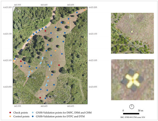 For evaluating dense clouds, DEMs, and CHM, we used another 59 additional independent GCPs as GNSS validation points; 14 served to evaluate the Dense Surface Point Cloud (DSPC), DSM, and CHM; and the remaining 45 were used for assessing the DTPC and DTM).