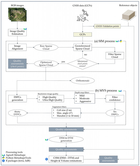 The Structure from the Motion and Multi-View Stereopsis (SfM-MVS) method was employed to generate point clouds, from which DSMs, DTMs, and orthomosaics were derived. This process was performed using Agisoft Metashape Professional version 1.7.2, along with Metashape Python scripts provided by [50].