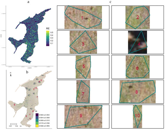 The spatial distribution of reprojection errors (REs) based on optimized tie points is illustrated using Voronoi tessellations, as shown in Figure 5a. A closer look at the error distribution reveals variability across the study area, confirming that there is no evident autocorrelation between the errors of adjacent tessellations.