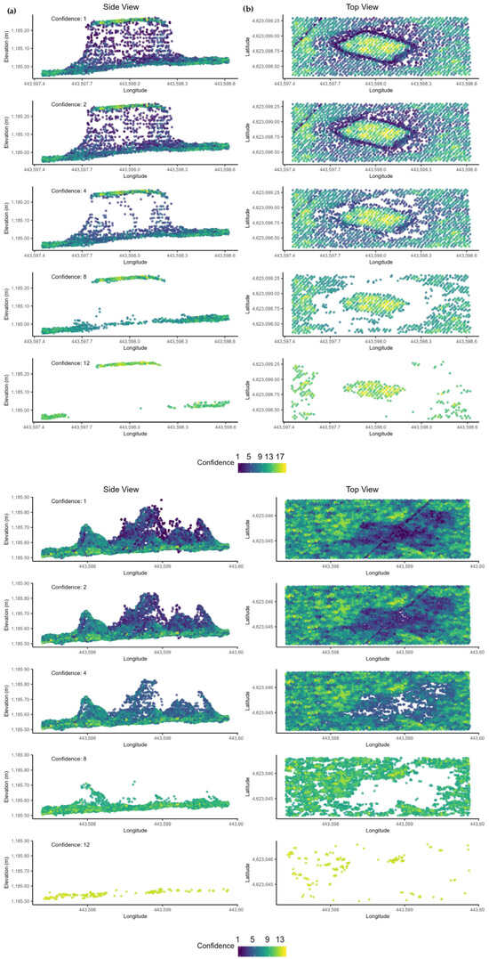 The MVS approach, relaying on multiple depth maps (refer to Appendix A), is tailored to automatically reconstruct 3D objects from various images [29]. It employs an optimized sparse cloud to consolidate individual depth maps into a cohesive 3D model [30]. Factors such as image resolution, overlap, and the chosen depth filter determine the capacity of MVS to produce dense clouds of varying magnitudes, affecting both the elevation accuracy of each point and the density of the resulting cloud [38]. The confidence of a point within this cloud stems from the number of depth maps supporting its position. Points corroborated by numerous maps are deemed more trustworthy, having been verified from different angles. On the other hand, points supported by fewer maps may be considered unreliable or even spurious. The precision of these maps improves with the caliber of the images and the degree of overlap, guaranteeing the validation of each point from multiple perspectives. Decisions regarding confidence thresholds and how to achieve high reliability in the points are interconnected processes. They hinge on a blend of quality image capture practices and the appropriate software adjustments.
