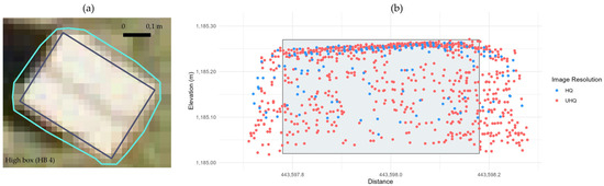 We hypothesize that the observed volume overestimation stems from two primary causes: (i) shadows appearing on the anti-solar side of the boxes, and (ii) image saturation due to the flat, highly reflective nature of the boxes. Such factors cause the point clouds to extend beyond the boxes’ true dimensions, thereby inflating their surface estimates. Height discrepancies mainly originate from the isolated terrain points projected in areas covered by shrubs (see Appendix B; Figure A1). Specifically, there is a noticeable lack of point density at the boxes’ bases, leading to a skewed vertical distance between the ground’s lowest point and the top of the boxes. Despite these challenges, the highest accuracy was achieved with a CHM segmented by the boxes’ true surface, processed from DEMs using UHQ image resolution, a mild depth filter, and the maxdist set to 5 mm. Our findings align with those of [38,61], who reported improved vegetation height accuracy when using a mild depth filter combined with UHQ image resolution for DSPC creation.