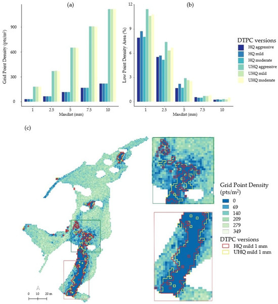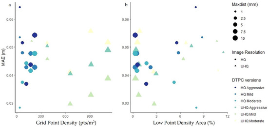 - Stricter maxdist settings with coarser resolutions enhanced microtopographic accuracy but increased uncertainty in low-density areas and computational load due to redundant points in coarser resolutions’ image versions.