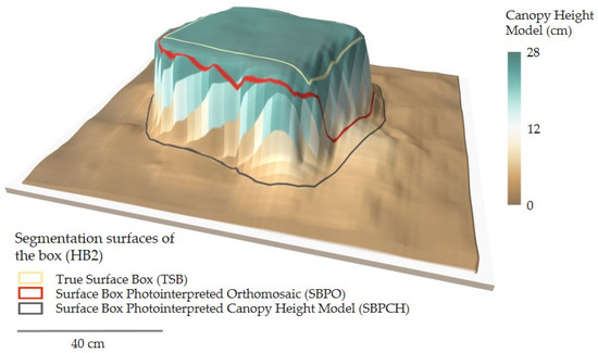 The scrutiny of segmented reference box surfaces, such as orthomosaic and CHM, necessitates meticulous attention. While these surfaces conform to predefined box dimensions, as detailed in Section 2.1.2, one must recognize the inherent subjectivity introduced through photointerpretation. Such subjectivity can lead to discrepancies in these surface dimensions. Image pixels might be affected by external factors like shadows or stark contrast, altering their perceived shapes, irrespective of the actual surface type.