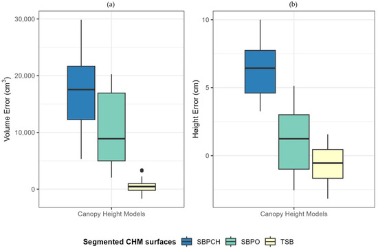 To understand how these surface inconsistencies influence CHM precision, we juxtaposed the segmented surfaces against the actual reference box surfaces. In our study, three segmented CHM variants were assessed, true surface at the top of the box (TSB), surface of the box photointerpreted on the orthomosaic (SBPO), and surface of the box photointerpreted on CHM (SBPCH).
