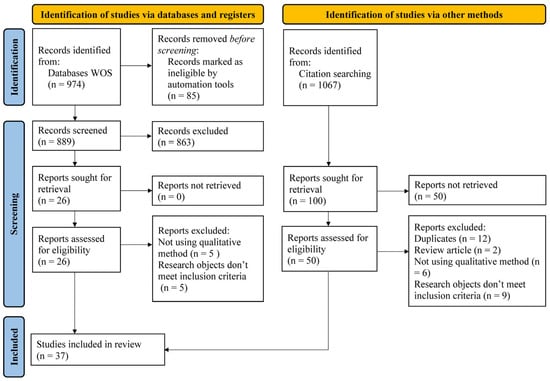 The database search identified 974 documents (Figure 1), and an automated tool was used to exclude 85 articles that failed to meet the criteria, 863 articles through title and abstract screening, and 10 articles through full-text screening (5 did not use quantitative analysis, 2 did not examine specific wildfire characteristics, and 3 focused on broad human interventions). In addition, 50 documents were identified from reference searching of the resulting articles that met the criteria, among which 29 articles were excluded through full-text screening (12 were duplicates, 2 were reviews rather than empirical studies, 6 were non-quantitative analyses, and 9 did not meet other inclusion criteria). A total of 37 studies were included in the analysis (Figure 1, Table 1).
