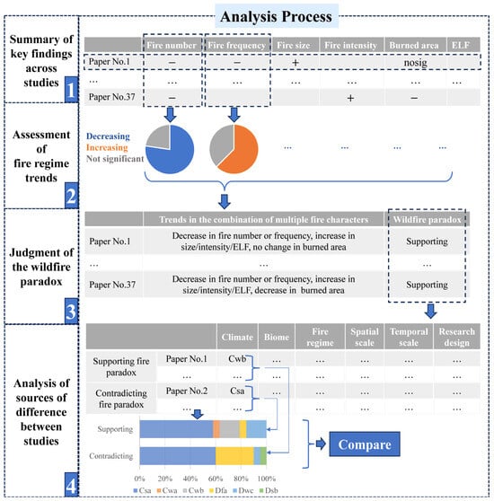 Analysis of sources of difference between studies (Figure 2 (4)). Whether studies supported the wildfire paradox would depend on the study area and design. To test this hypothesis, the study settings (climate, biome, and pyrome) and study designs (spatial and temporal scales and study design type) of the literature supporting and contradicting the wildfire paradox were summarized, respectively. The differences in the proportional composition of each variable between the two sets of studies were compared. The reasons for the differences between the results in the literature were identified by searching for variables for which the composition differed significantly between groups. Due to sample size limitations, differences between groups were investigated by observation and qualitative analysis only, without statistical testing.
