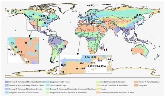 Geographical locations of studies included in this review and global biome map. Code numbers refer to the study ID values (Table 1). Code numbers such as “1-1” refer to the first study area of the first study.