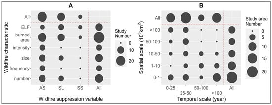 (A) Number of studies by wildfire characteristic and suppression variable. (B) Number of study areas by spatial and temporal scale. “AS” is active wildfire suppression. “SL” is wildfire suppression level. “SS” is wildfire suppression strategy.