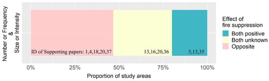 Proportion of study areas simultaneously exhibiting both positive, both unknown, or opposite effects of fire suppression on fire number (or frequency) and fire size (or intensity). “Both positive” indicates that fire suppression reduces both fire number (or frequency) and size (or intensity). “Opposite” indicates opposite effects of fire suppression on fire number (or frequency) and fire size (or intensity). Code numbers refer to the study ID values (Table 1).