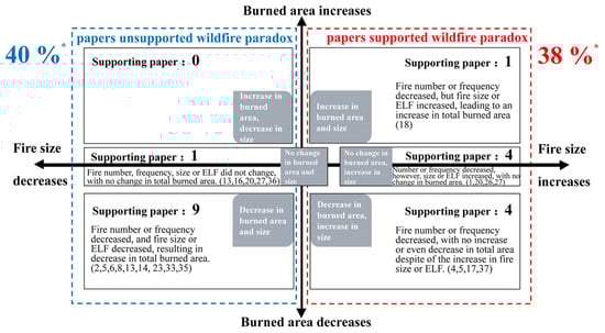 Appreciation of the wildfire paradox (Figure 2 (3)). Wildfire characteristics are not independent of each other [], and focusing only on changes in individual wildfire characteristics risks missing hidden information regarding overall wildfire regime changes; therefore, information on changes in combinations of multiple wildfire characteristics was further synthesized across the literature. Based on the definition of the wildfire paradox and trends in wildfire size, intensity, or ELF, it was further determined whether the study supported the wildfire paradox. If the study concluded that fire suppression had led to increased fire size, intensity, or ELF, it would be described as supporting the paradox, and vice versa. If the literature failed to examine the variability in these characteristics, it was marked as unknown.