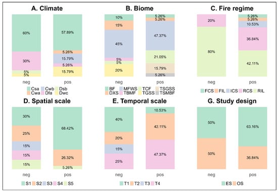 Figure 8 shows the significant differences in the literature supporting and not supporting the wildfire paradox regarding study setting and design. Studies opposing the paradox mostly occurred in the RIL pyrome (Figure 8C). In contrast, those supporting it covered all pyromes (Figure 8C), and studies supporting the paradox had smaller spatial and longer temporal scales than those opposing it (Figure 8D,E). Regarding the regional context, the most striking difference was the proportion of fire regime pyrome composition (Figure 8C). A total of 80% of the studies that opposed the paradox were in the RIL pyrome, which was significantly higher than the proportion of studies that supported the paradox. The remaining 20% were in the RCS pyrome, whereas the literature supporting this conclusion covered all five fire zones. Although the differences in climate and biome composition ratios were relatively insignificant, notable patterns emerged (Figure 8A,B). For example, subtropical humid (Cwa, with a distinct dry season) and subtropical mountain (Cwb, with a distinct dry season) climates were only observed in the literature supporting the paradox. The former accounted for 30% of the literature. In contrast, temperate continental humid (Dfa) climates were only reported in the literature opposing it (Figure 8A). Similarly, temperate grassland, savannah, and shrubland biome only appeared in the studies against the paradox, accounting for 30% of the studies. In contrast, tropical and subtropical moist broadleaf forest biome only appeared in the studies that supported the paradox (Figure 8B). Regarding study design, clear distinctions existed within the literature at the spatial and temporal scales (Figure 8D,E). Approximately 70% of the study areas supporting the wildfire paradox were concentrated at the smallest spatial scale (0–1000 km2), whereas only 10% opposed it. The spatial scale of the opposing literature was evenly distributed across all scales (Figure 8D). Almost 50% of the supporting studies were at the longest timescales (>100 y), while only 10% were at the shortest timescales (0–25 y). For opposing studies, 40% were at the shortest timescales (Figure 8E). The type of research design (Figure 8G) showed little difference, with slightly more observational research supporting the wildfire paradox.