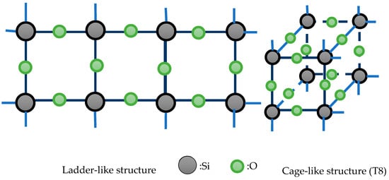 The synthesis and utilization of nanoparticles are of interest to the scientific community and are frequently reported in materials engineering journals. Nanomaterials such as organic–inorganic composites are important components for designing novel high-performance materials systems. The combination of a highly rigid inorganic filler and a flexible polymer matrix results in a synergistic enhancement in thermal stability [,,,,]. Polyhedral oligomeric silsesquioxanes (POSSs), with the empirical formula of RSiO1.5 (where R can be a hydrogen atom, alkyl, alkylene or acrylate), were first reported by Scott in 1946 []. They are regarded as some of the smallest silica nanoparticles, with diameters of 1–3 nm [,]. There are two structural forms of silsesquioxanes, including the ladder-like and cube-like structures (Figure 2). Compared to the traditional silicone-based materials, POSS has a higher thermal stability and good corrosion-inhibiting properties, and it is incorporated into an organic polymer matrix material to form nanocomposites [,,,,,,,,,,,,,,]. POSS-based copolymers have been shown to enhance mechanical and thermal properties.