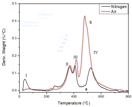 The comparison of the TGA traces of ATL-POSS obtained in nitrogen and air atmospheres is shown in Figure 3. Both curves indicate excellent thermal stability for the samples at a heating rate of 10 °C/min. The char yield of the ATL-POSS is about 74% in nitrogen and 54% in an air atmosphere. In comparison, a linear amine-terminated PDMS had a char retention of about 4.3 and 10.5% in nitrogen and air atmospheres, respectively []. The significant increase in char yield of ATL-POSS over the linear amine-terminated polysiloxane is indicative of the superior thermal stability of the ladder-like conformation. The weight loss in the early stage (peak I) of heating (T < 150 °C) is believed to be mainly due to the condensation of unreacted silanol and the evaporation of solvent residue. This assertion is supported by the presence of Si-OH in the IR spectrum of the low-temperature-treated samples. In Figure 4, the derivative TGA curves (DTA) of ATL-POSS are shown. There are three major derivative peaks labelled as peaks II, III and IV located in the temperature range of 300 °C to 600 °C. For the tests carried out in air atmosphere, DTA peaks II and III are slightly shifted towards higher temperatures, while peak IV is very intense and shifted slightly towards lower temperatures. As shown in Figure 4, there is a noticeable increase in the peak height for the samples tested in an oxygen atmosphere. Under inert nitrogen conditions, cyclic siloxanes are formed through an intramolecular reaction, resulting in structural redistribution. The presence of oxygen can catalyze this process of self-assemblage.