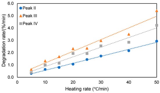 Dependence of the degradation rate, for the different stages of the thermal decomposition of ATL-POSS, on the heating rate. The TGA tests were performed under an air atmosphere.