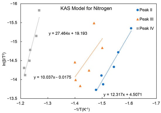 Data analysis using the KAS model (nitrogen) for activation energy calculation, for decomposition peaks, II, III and IV, as a function of the inverse of the isothermal testing temperature and heating rate.