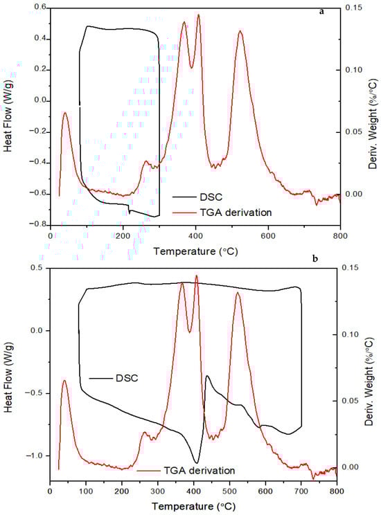 DSC thermograms for ATL-POSS overlaid with the TGA derivative curves (DTA) obtained in a nitrogen atmosphere at a heating rate of 10 °C/min, (a) 100–300 °C cycle; (b) 100–700 °C cycle.