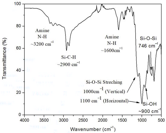 The FTIR spectra of ATL-POSS is shown in Figure 11. The FTIR transmittance peaks shown around 1000 cm−1 and 1100 cm−1 are due to asymmetric vertical and horizontal stretching vibration peaks of the Si-O-Si functional group []. The presence of these two FTIR transmittance peaks is indicative of the ladder-like structure. The other characteristic FTIR transmittance peaks, shown in Figure 11, are the 3200 cm−1 and 1600 cm−1 peaks due to the terminal amine functional group. The transmittance peak around 900 cm−1 is due to the terminal Si-OH functional group. The FTIR transmittance peaks in the wavenumber range of 2800–3000 cm−1 are due to the Si-C-H asymmetric stretching vibration.