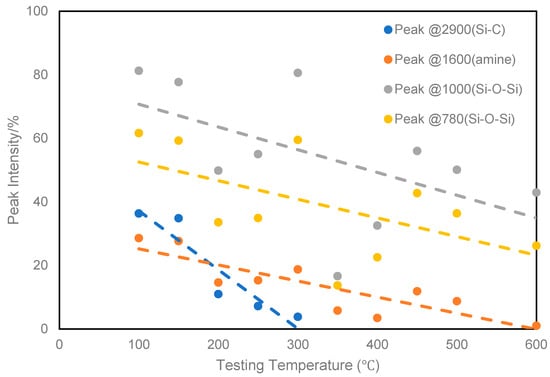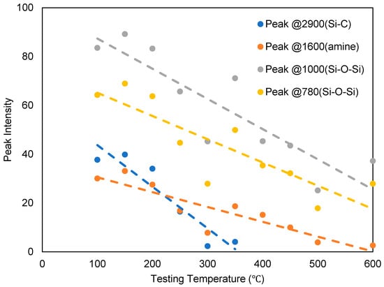 As was discussed in the previous section, the thermal behavior of ATL-POSS is affected by the atmosphere, whether oxidizing or inert, under which the test is carried out. Figure 12 and Figure 13 show the FTIR spectra of ATL-POSS that were thermally treated at various temperatures ranging from 100 to 600 °C under a nitrogen atmosphere (Figure 12) and an air atmosphere (Figure 13). As shown in Figure 12 and Figure 13, the peak intensity for the -Si-C, -NH2 and -Si-O-Si functional groups decreased with the increasing testing temperature due to their decomposition and the volatilization of the gaseous residues.