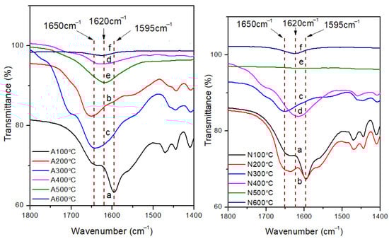 FTIR spectra showing changes in the transmittance peaks around 1600 cm−1 with changing testing temperatures (a: 100 °C, b: 200 °C, c: 300 °C, d: 400 °C, e: 500 °C, f: 600 °C) for the samples tested in air (left) and nitrogen (right) at a heating rate of 30 °C/min.