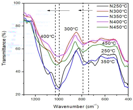 FTIR transmittance spectra showing the shifting transmittance of the Si-O-Si group from 991 cm−1 (at 250 °C) to 1017 cm−1 (at 450 °C) and from 744 cm−1 (at 250 °C) to 790 cm−1 (at 450 °C) in a nitrogen atmosphere, at a heating rate of 30 °C/min. The arrows indicate the shift to higher wavenumber.