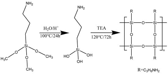 Synthesis: APTMS (0.02 mol) was dissolved in 20 mL of toluene at room temperature. 25 mL of the HCl solution (0.1 M) was added in a drop-wise manner into the APTMS solution under stirring. The hydrolysis of APTMS was carried out for 24 h at 100 °C in an oil bath. Then, 0.1 g of TEA was added to the reactor after 24 h of hydrolysis. The temperature of the oil bath was raised to 120 °C and a condenser was used for refluxing. The reaction was carried out for another 72 h. The reaction scheme is shown in Scheme 1. The reaction mixture was separated into two layers. The organic layer was crystal clear, while the aqueous phase was cloudy. The aqueous layer was separated by means of a separating funnel and washed thrice in toluene to remove any remaining silane. The resulting liquid sample was dried at 120 °C for 14 h (overnight) under vacuum conditions. The final product was a clear transparent solid.