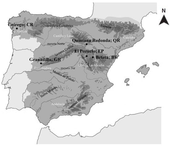 Data were collected from 5 locations in the Iberian Peninsula (Figure 1). The 5 sites covered a wide range of climatic and ecological characteristics and included pine stands with different specific compositions and characteristics, representing the environmental variations of each forest type (Table 1). In Beteta (BE), covered by Pinus nigra Arn. subsp. salzmannii, and El Pozuelo (EP), a mixed forest of Pinus nigra (84 ± 14%) and Pinus pinaster Ait. (14 ± 14%) (both in the Cuenca Mountains, Iberian Mountain Range, Central Spain), 135 trees were selected for studying (n = 9 plots in each site). In Quintana Redonda (QR, Soria, Iberian Mountain Range, Central Spain), 54 trees (n = 5 plots) in a pure Pinus pinaster stand were selected for studying. In Coirego (CR, Pontevedra, NW Spain), 18 trees in a pure Pinus pinaster stand (n = 18 plots) were selected for studying. In Granadilla (GR, Cáceres, western Central Mountain Range), 32 trees in a mixed stand of Pinus pinaster (82 ± 31%) and Pinus pinea L. (18 ± 31%) (n = 3 plots) were selected for studying. Tree- and stand-level data were thus obtained for 374 individual trees of 3 different species (Pinus nigra, Pinus pinaster and Pinus pinea), across a total 44 plots (12 mixed and 32 pure forest stands).