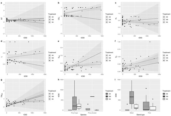 Pinus nigra seems to reach lower tC60 values (Table 4); although, the data obtained in the studied plots for Pinus nigra are more numerous than Pinus pinaster or Pinus pinea. The tC60 variable reached a wider range of values during the summer burns (Figure 2h). Regarding stand structure, mixed or pure (Table 4), Figure 2i shows a more normalized distribution of the data in the mixed stand, with lower tC60 values in the pure stand.