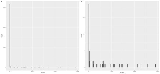 Figure 3. Distribution of the tC60 variable (a) with the presence of zeros; and (b) without the presence of zeros.