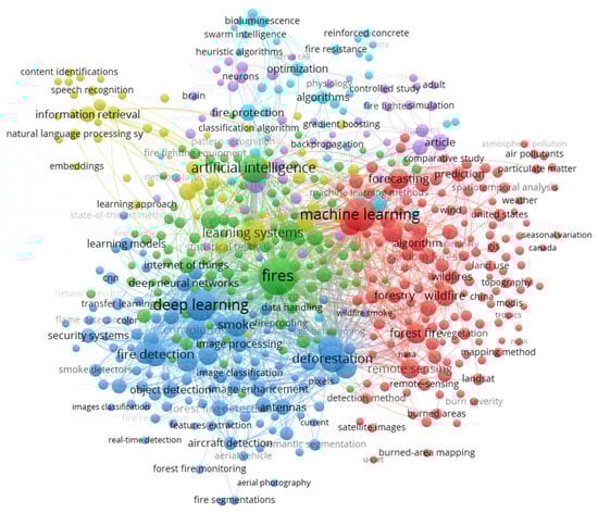 (KEY (“fire” “deep learning”) OR KEY (“fire” “artificial intelligence”) OR KEY (“fire” “machine learning”) OR KEY (“fire detection” “machine learning”)) returned 2332 documents, which were exported as Scopus files while retrieving the author keywords and indexing keywords fields. The file was processed by means of the bibliometric analysis tool VOSviewer (a software tool for constructing and visualizing bibliometric networks) conducting a co-occurrence analysis of keywords. A total number of 13,521 keywords were identified and the minimum number of occurrences of a keyword was set to 10. Out of the total number of keywords, 505 keywords met the threshold. The first 10 keywords (sorted by the total link strength) are presented in Table 1.