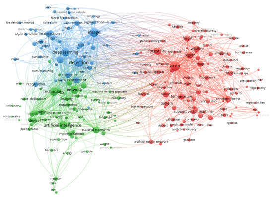 In order to gain further insight into the terms and the relationships between them occurring in the main flux of publications on the topic of fire detection using artificial intelligence, a co-occurrence analysis was conducted on the abstracts of the documents returned by the search process. A term was included if it occurred more than 20 times. The list of terms was cleaned, removing the terms with general use (no necessarily related to the topic), resulting a number of 235 items. The analysis tool returned three clusters containing 112, 66 and 57 items, respectively. The co-occurrence graph resulting from the analysis of the abstracts is presented in Figure 2.