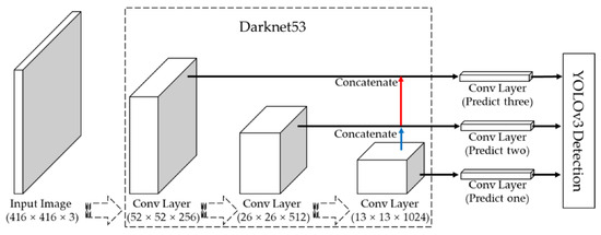 YOLOv3 architecture. Blue and red lines represent two-fold up-sampling. Reprinted/adapted from Ref. [30] under the terms and conditions of the CC BY license. ©2019, MDPI.